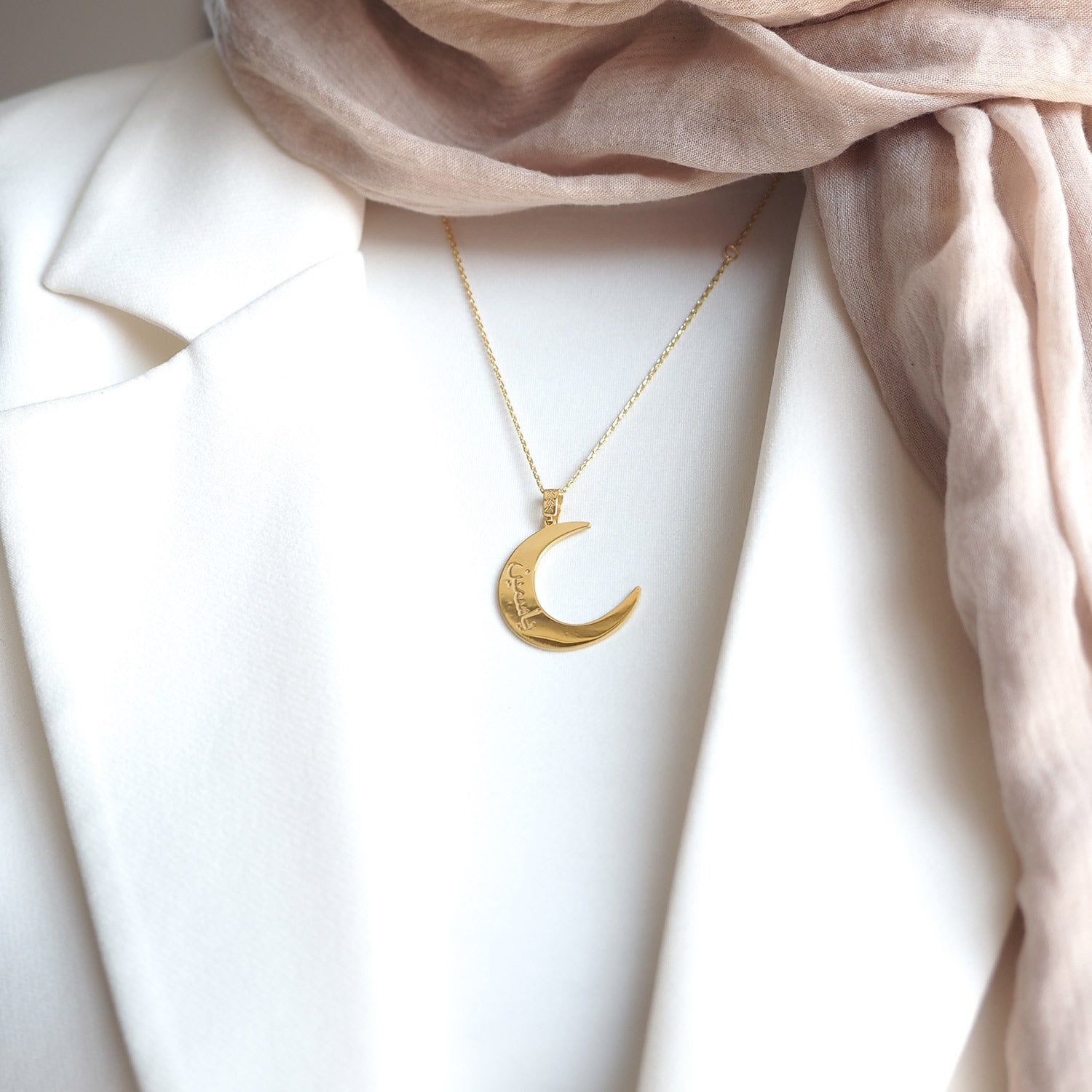 The Custom Name Necklace with Crescent lets you carry a cherished name close to your heart, framed by the crescent — a symbol of hope, guidance, and new beginnings.