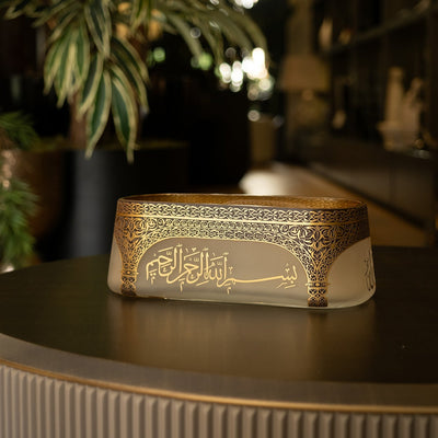 Elegant glass objects inspired by Islamic art. Each piece is handmade, featuring calligraphy and traditional motifs that bring spiritual depth and timeless beauty to your space.