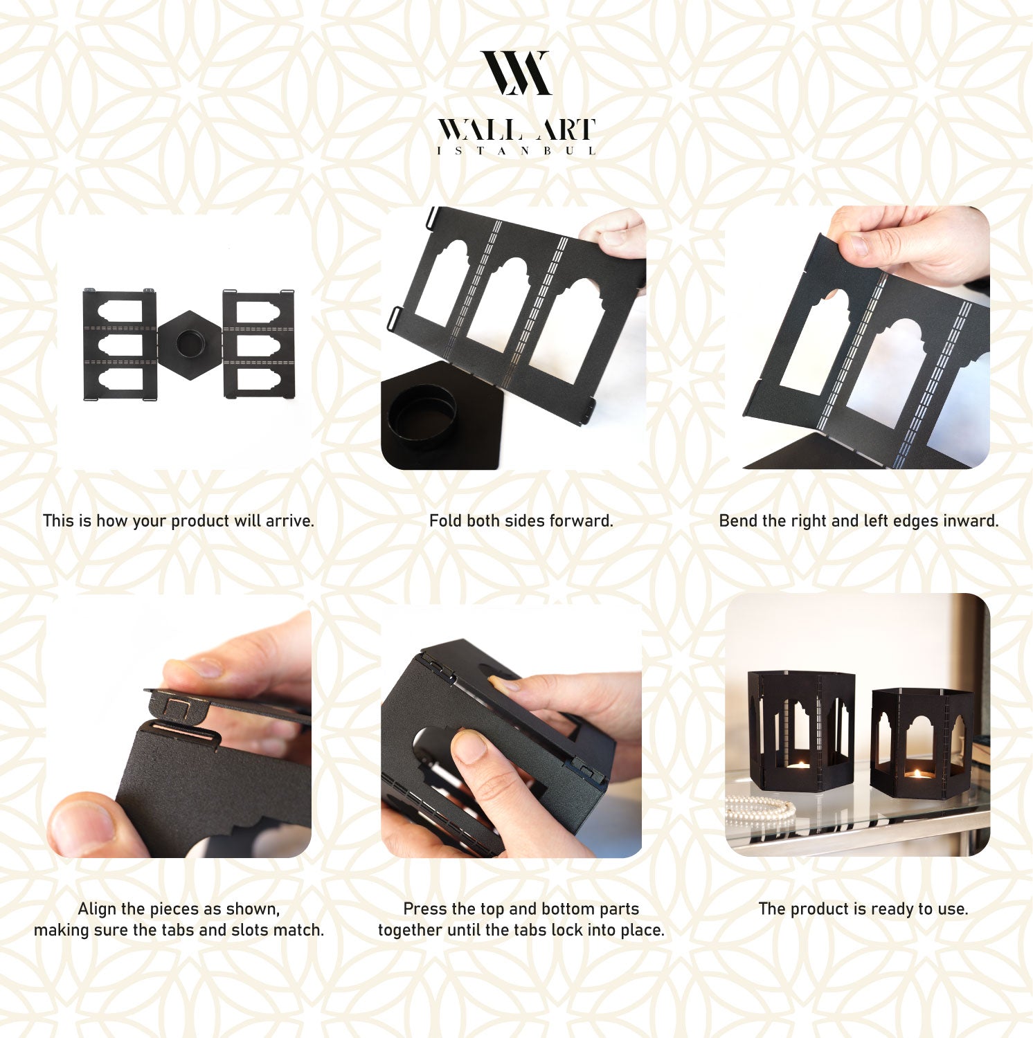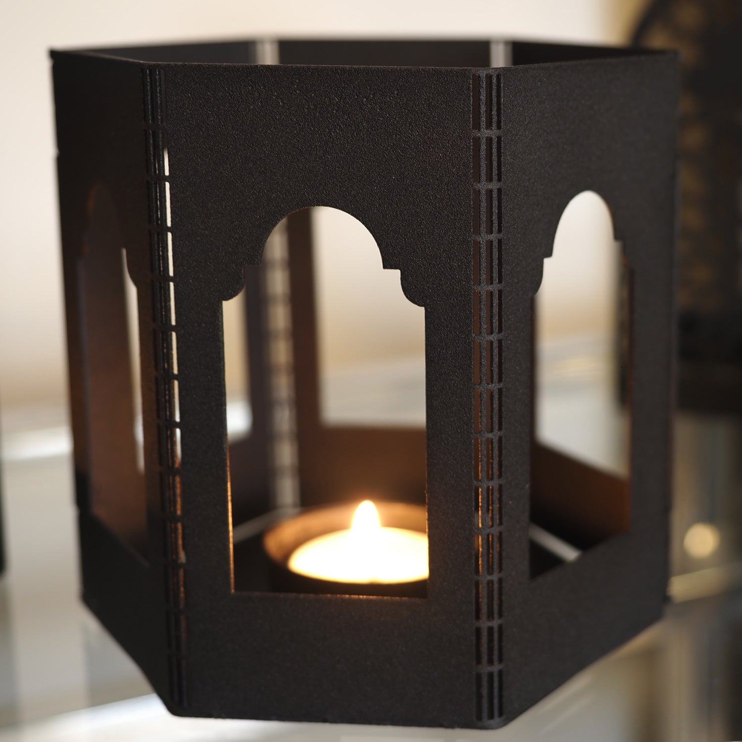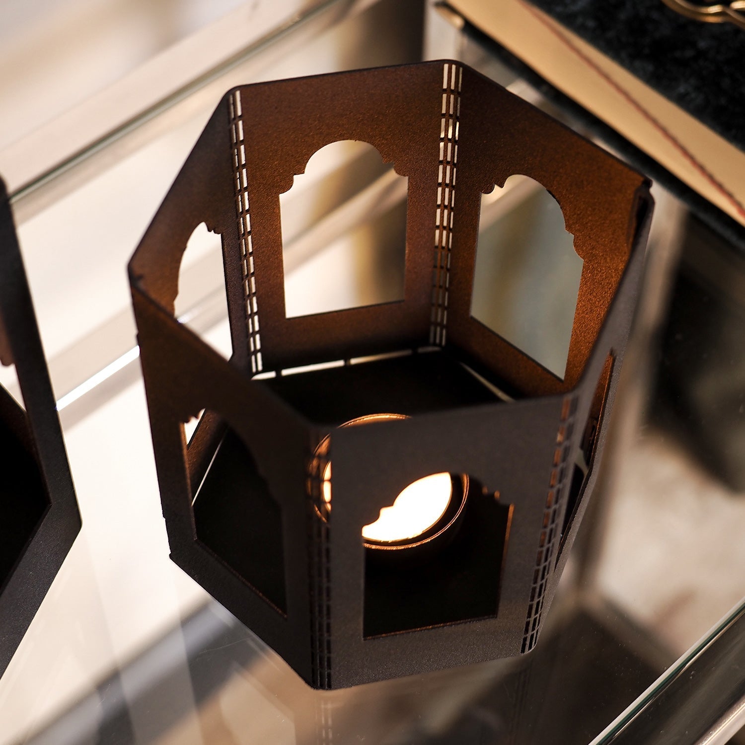 Crafted from metal, the candle holders are shaped with window forms inspired by Islamic architecture. When a candle is placed inside and lit, the light gently filters through the patterns, creating a soft and balanced atmosphere around it.