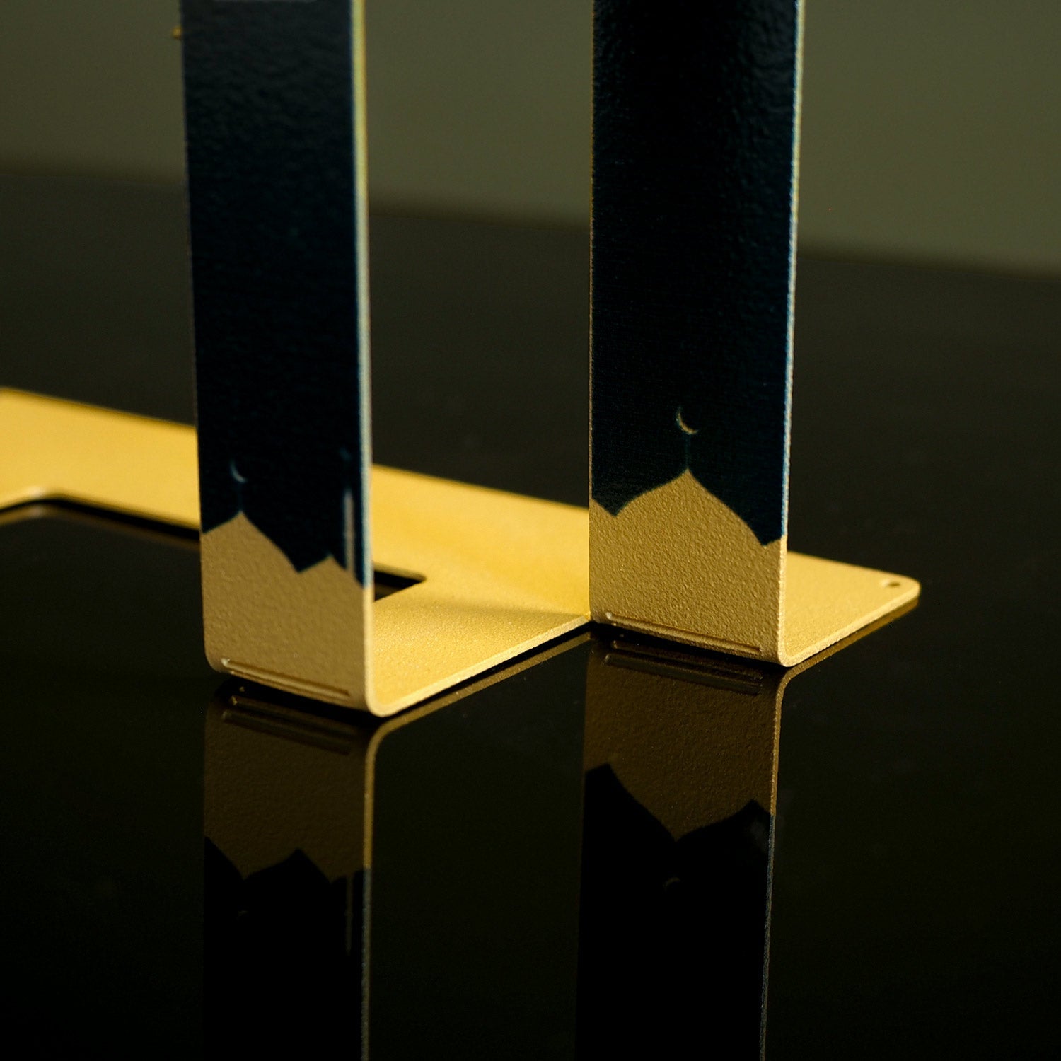 Crafted from metal, the design arrives flat. When the innermost piece is removed and bent, it becomes a candle holder; the outer piece, shaped separately, transforms into a Quran stand. Within a single form, both light and the Word find their place.