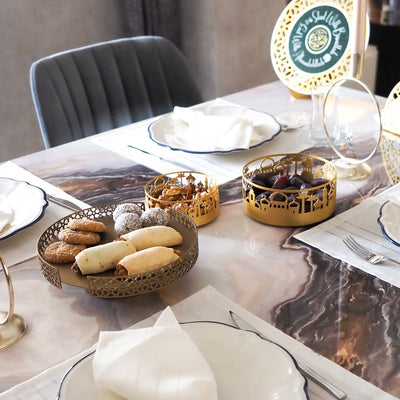 • This Beautiful and Elegant Metal Trays with Mosque Pattern are perfect for your Iftar and Suhoor tables and serving your desserts. Show off your festive Ramadan spread with this set of three trays. You can also use them as decor in your home.