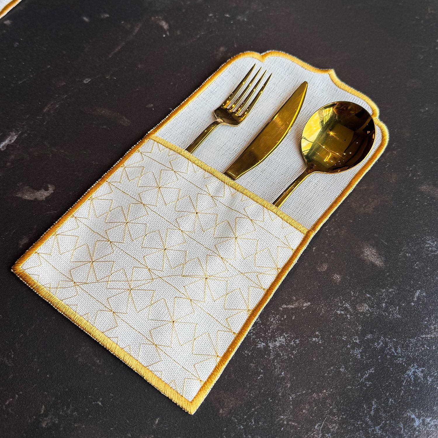 Inspired by Islamic motifs, this 3-piece fabric table setting includes a placemat, napkin, and cutlery holder. Perfect for iftar gatherings and special occasions, it brings warmth, harmony, and a graceful touch to your dining table. 🌙✨