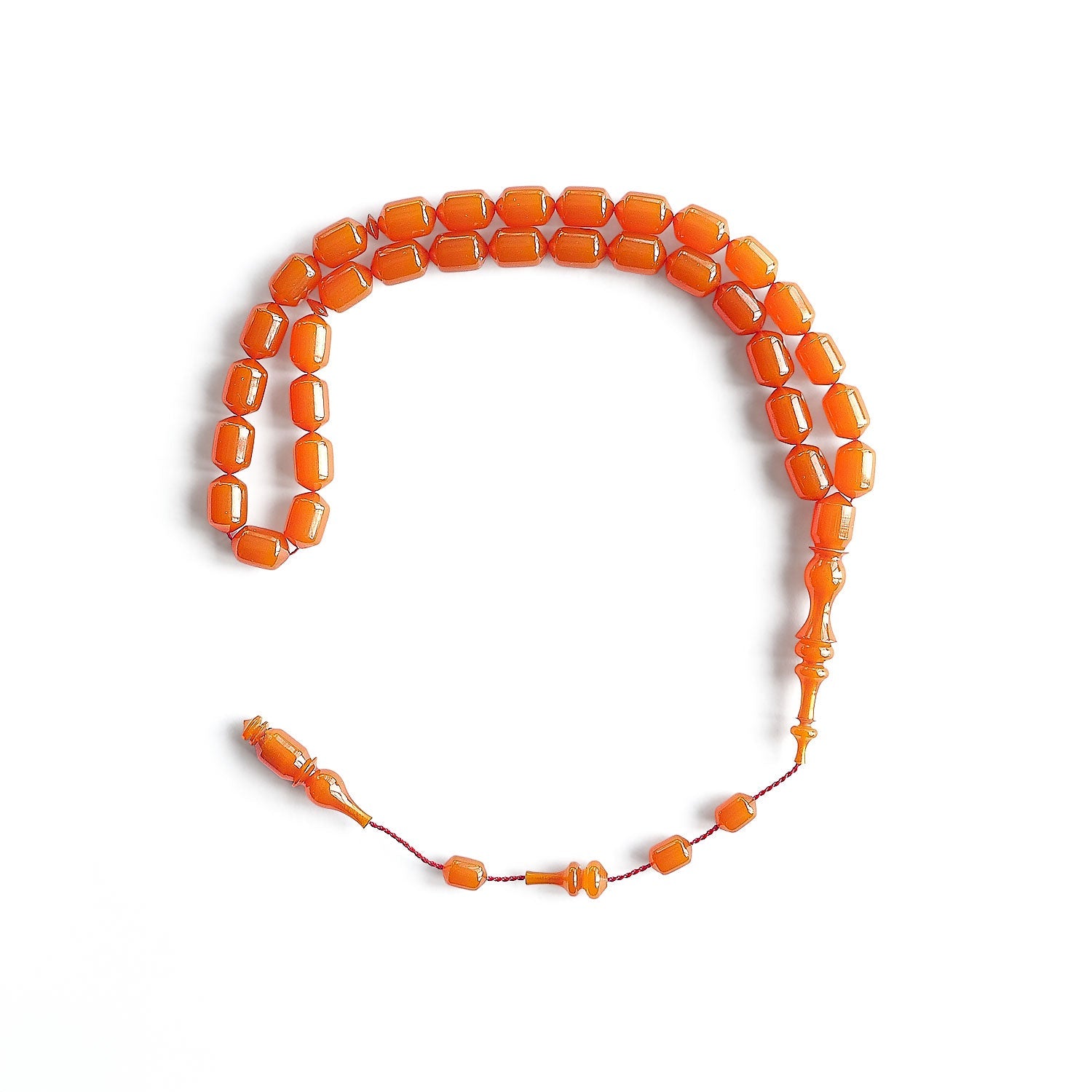 This handcrafted tasbeeh features 33 smooth fire amber beads, offering a warm tactile feel ideal for daily prayer and spiritual reflection. The natural amber tones give each piece a unique charm.