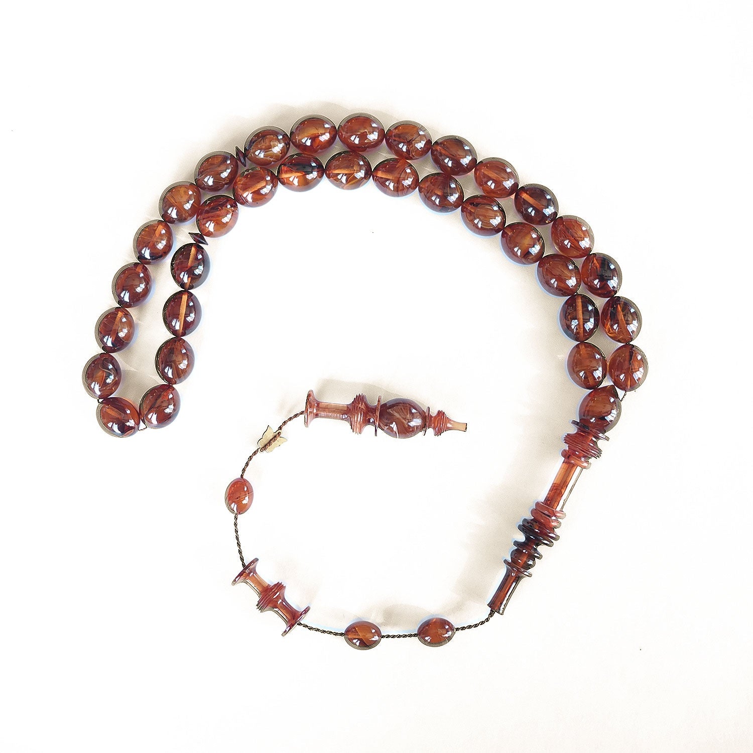 This handcrafted tasbeeh features custom cast Catalin 33 beads with a smooth oval form, offering a balanced presence that combines visual depth with a comfortable, flowing grip.